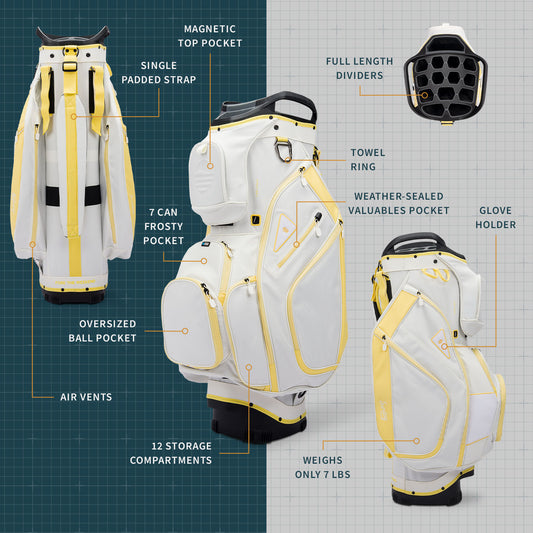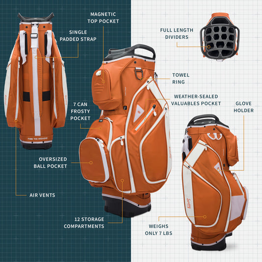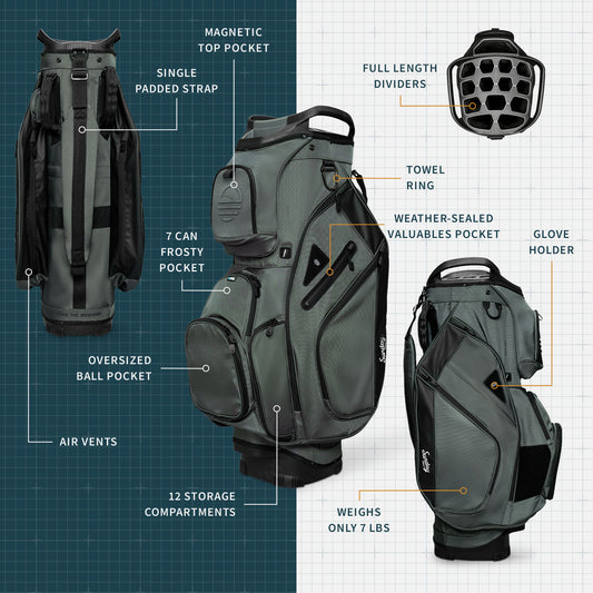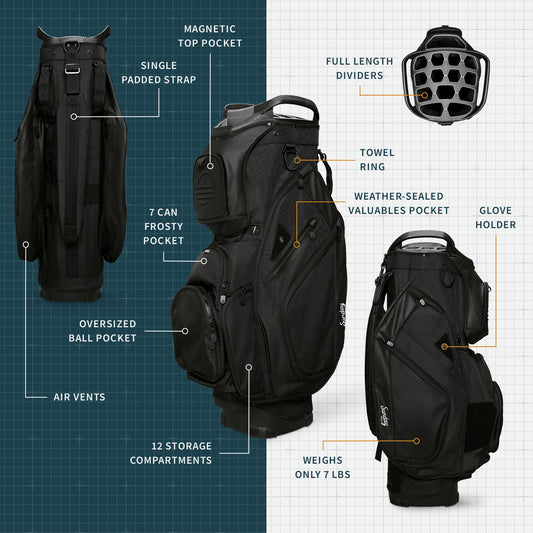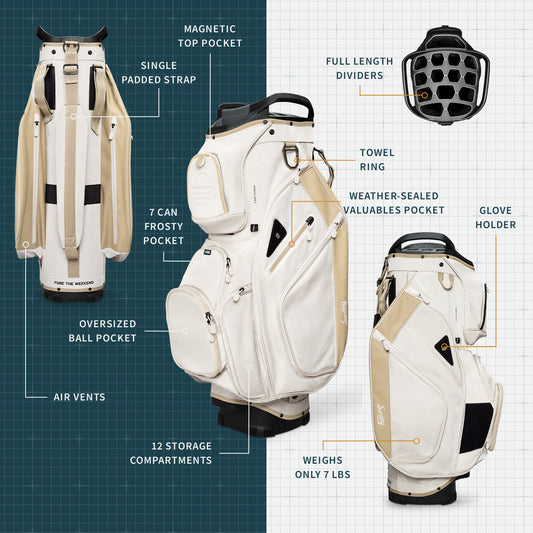 A cart bag that delivers on storage without the bulk. The Big Rig is surprisingly lightweight yet packed with space for all your gear, making organization effortless. Every detail is designed with the rider in mind—from seamless cart compatibility to intuitive pocket placement—so everything you need is always within reach.