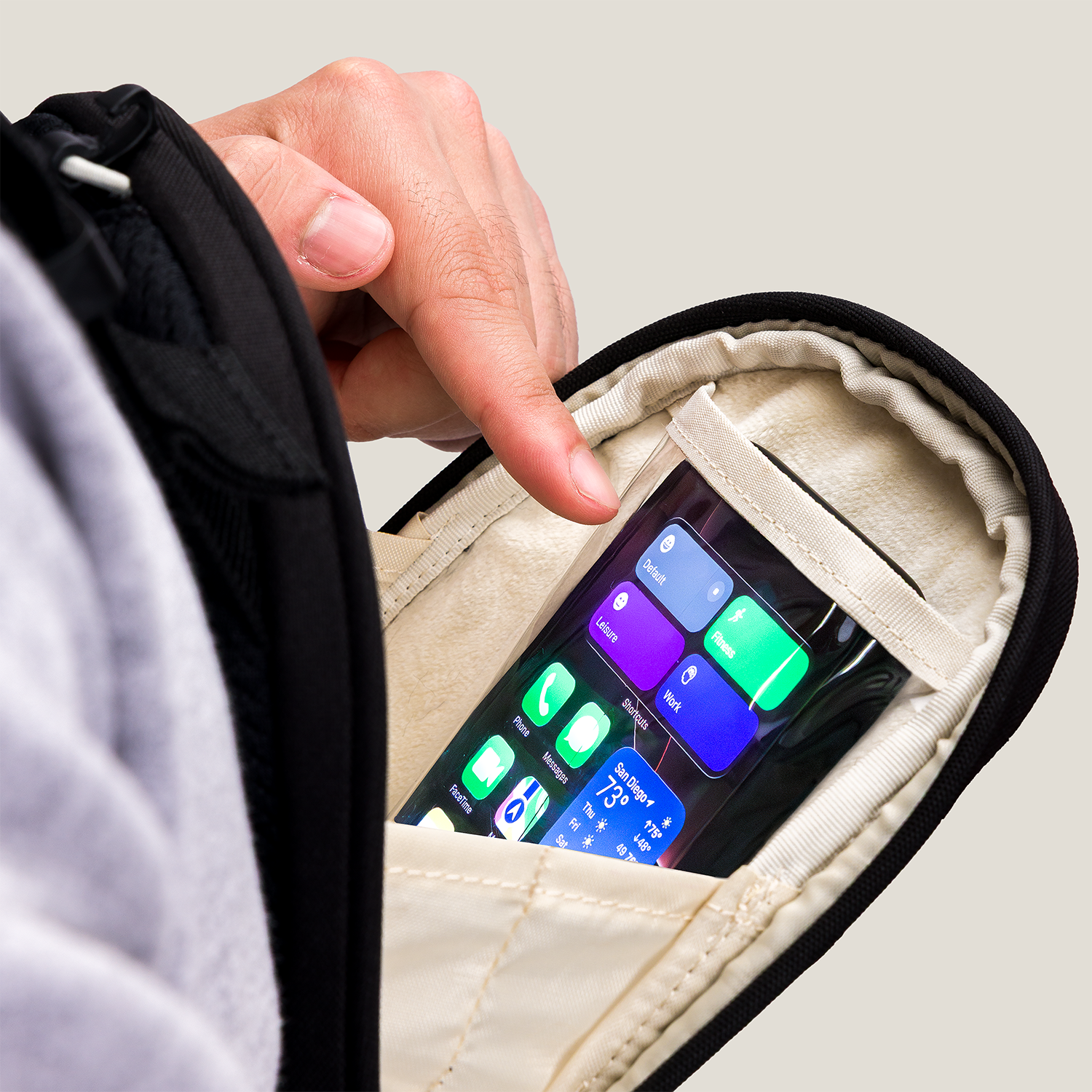 • Materials: Breathable mesh, velour-lined pockets, PVC touch-through phone pane