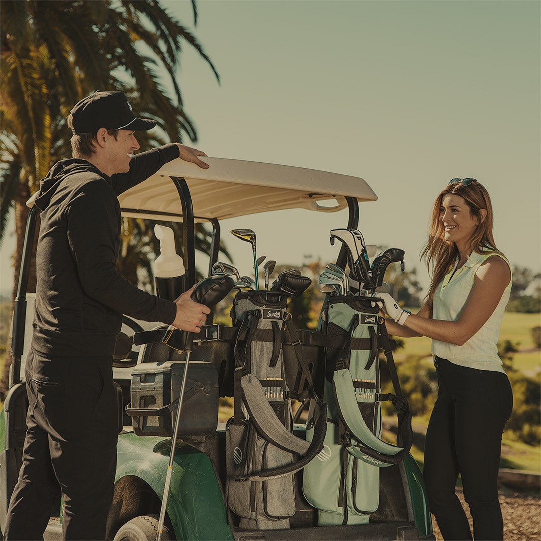 Yes, the El Camino can be used on a riding cart, push cart, or trolley, thanks to its versatile design and flat base. Take one to two over your least used clubs out of this walking golf bag and you’ll be good to go.