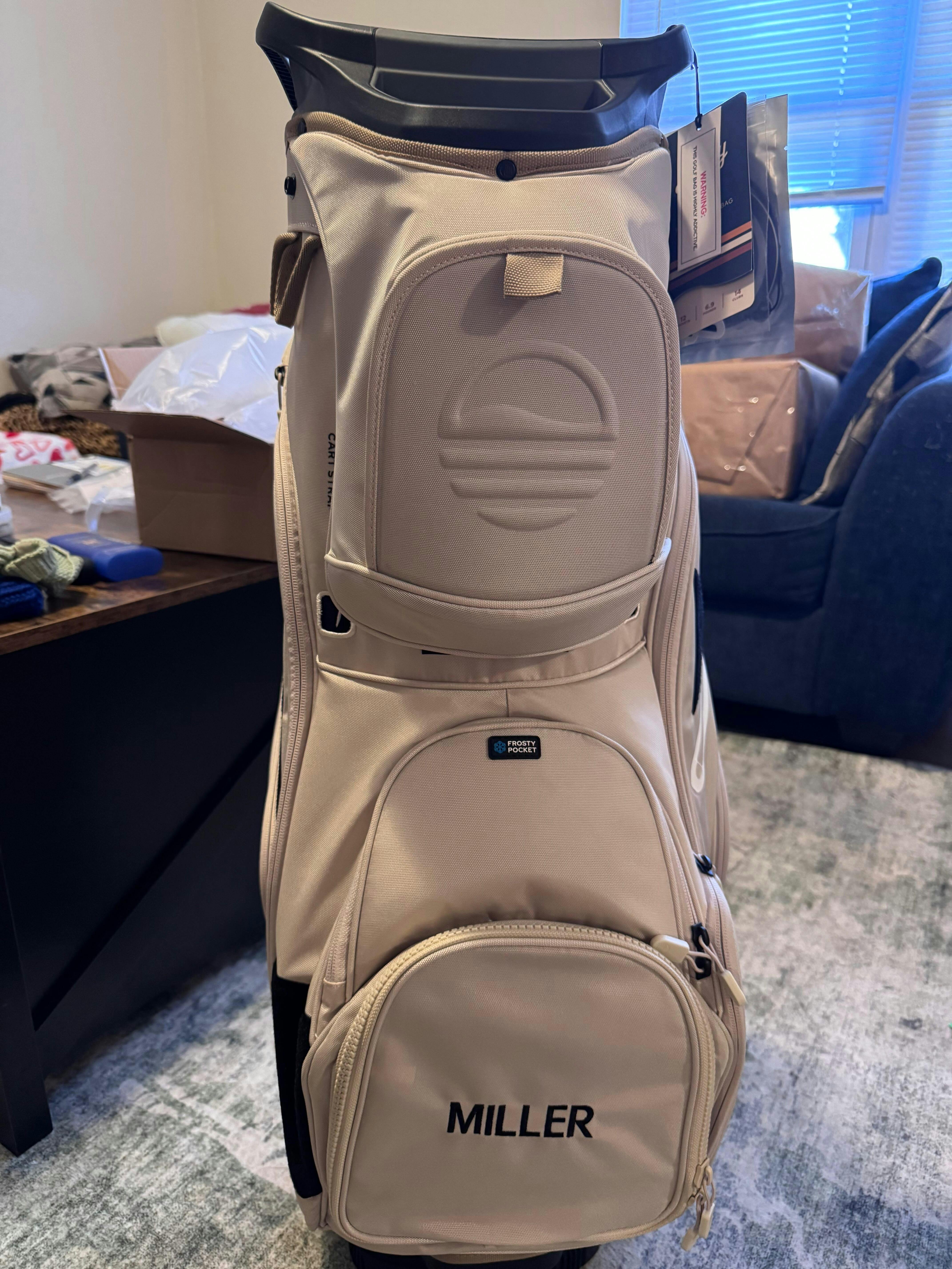 Beautiful! I absolutely love it. I had mine embroidered. I will upload an image. Excellent communication. Delivered on time even with getting the extra attention with having my name put on it. Did I mention outstanding communication? lol That is very rare nowadays. Extremely light weight. I fit my full club set in. Nice place to keep tees organized. Lots of easily accessible pockets for glove & plenty of balls. ⛳️ Thrilled I chose this company. A++++++
