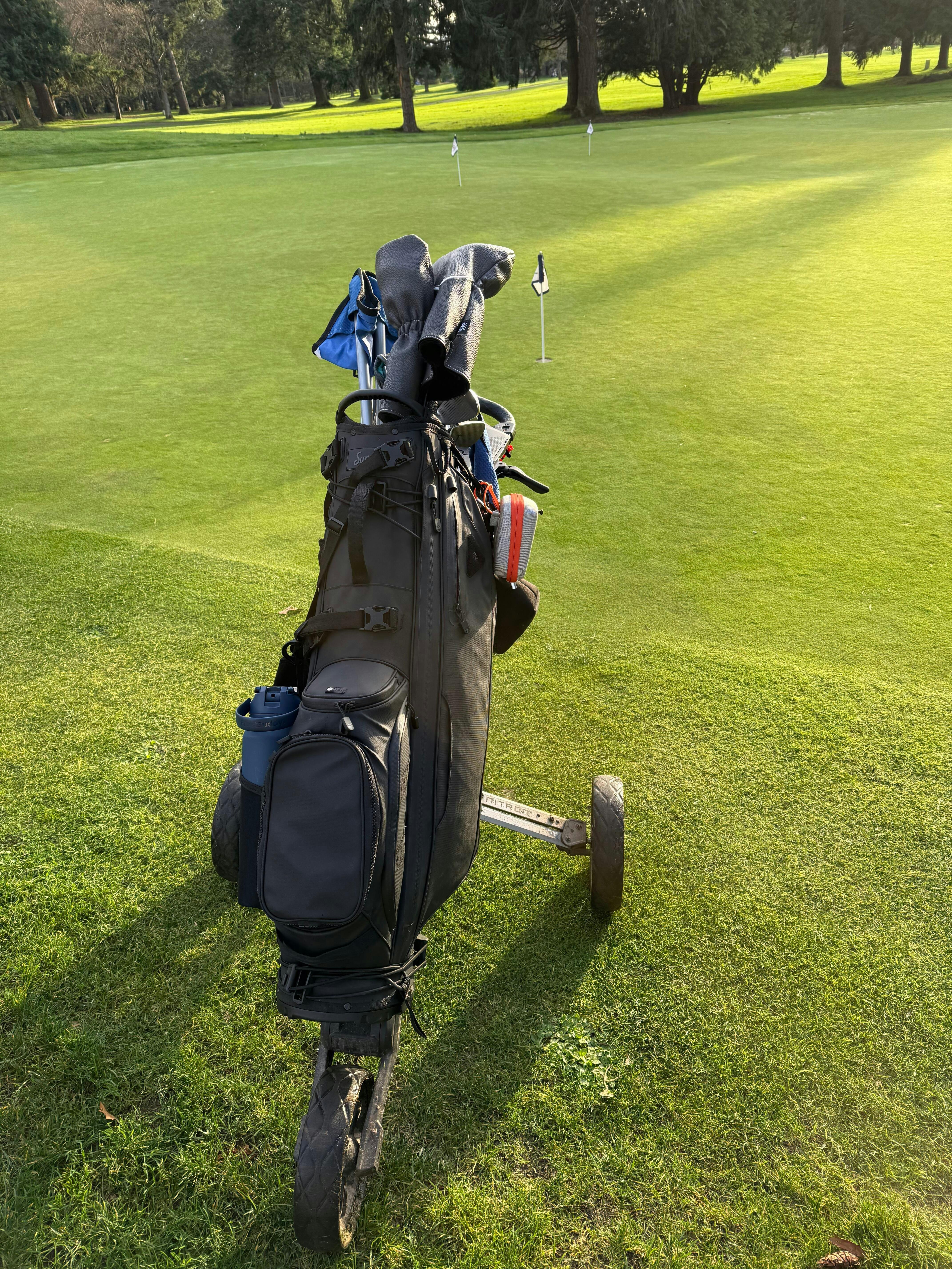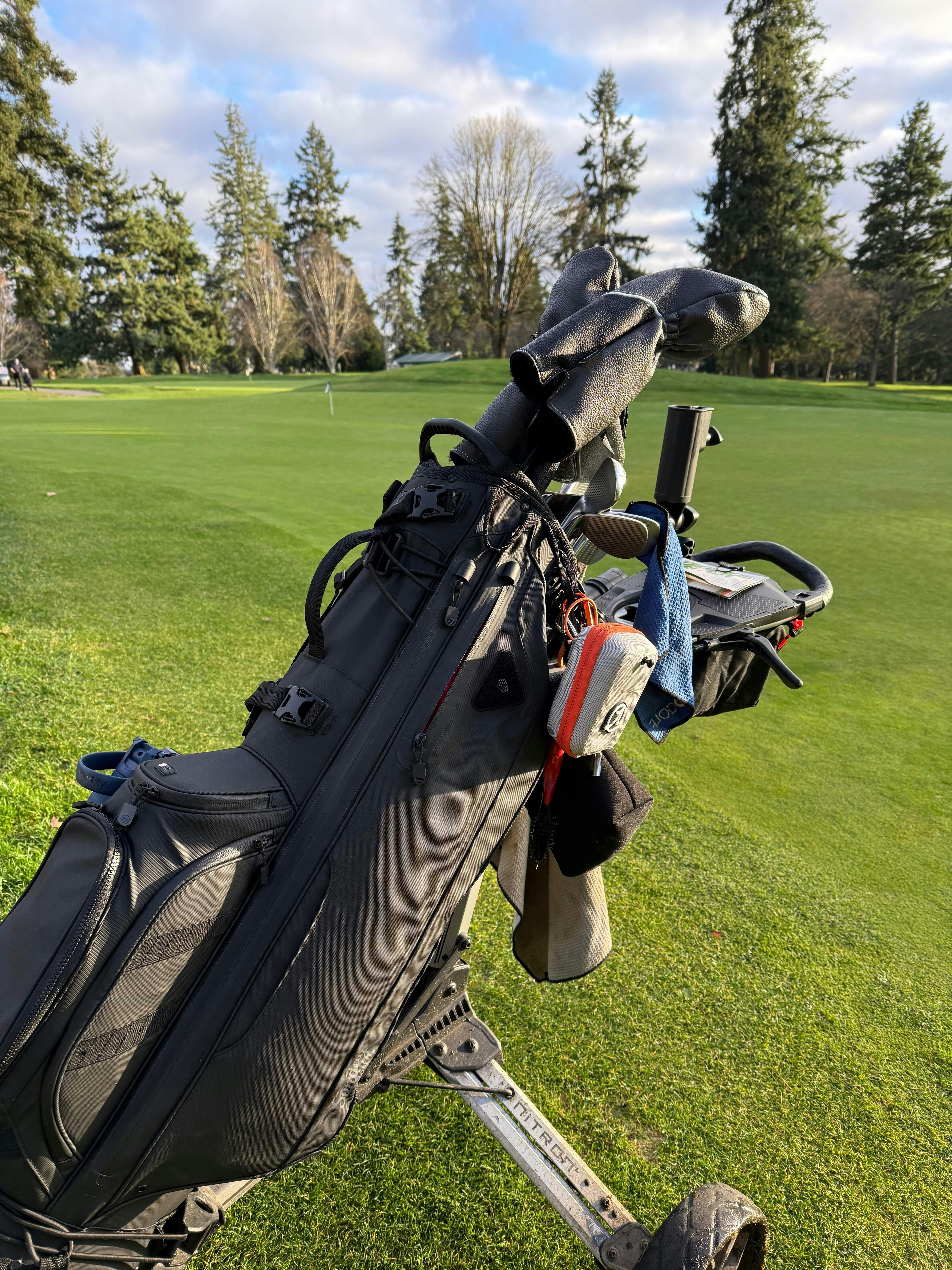 I can’t imagine owning a higher quality bag made for resisting water. I mean, even the rain hood is made out of a “rain coat“ type of material. It was not an afterthought, it was part of the planned design. These Sunday Golf guys are good! And I LOVE the tee holders on the outside of the smell proof pocket. Also, I’ve always been the golfer that has a caddy/ pouch on the towel ring to hold extra stuff. But with the smell proof pocket, I don’t even need one of those anymore! The full club dividers are awesome as I don’t deal with much club tangle anymore, if ever. I love that the bag stands up straight on its own, and the fully round bottom of the bag makes it easy to fit on a cart. And last but not least…to my Nitron Push Cartel members…this bag fits on our push carts! Look at my pictures. It’s a snug fit, but it essentially sits on the cart like a bag with “Top Lok” technology would.