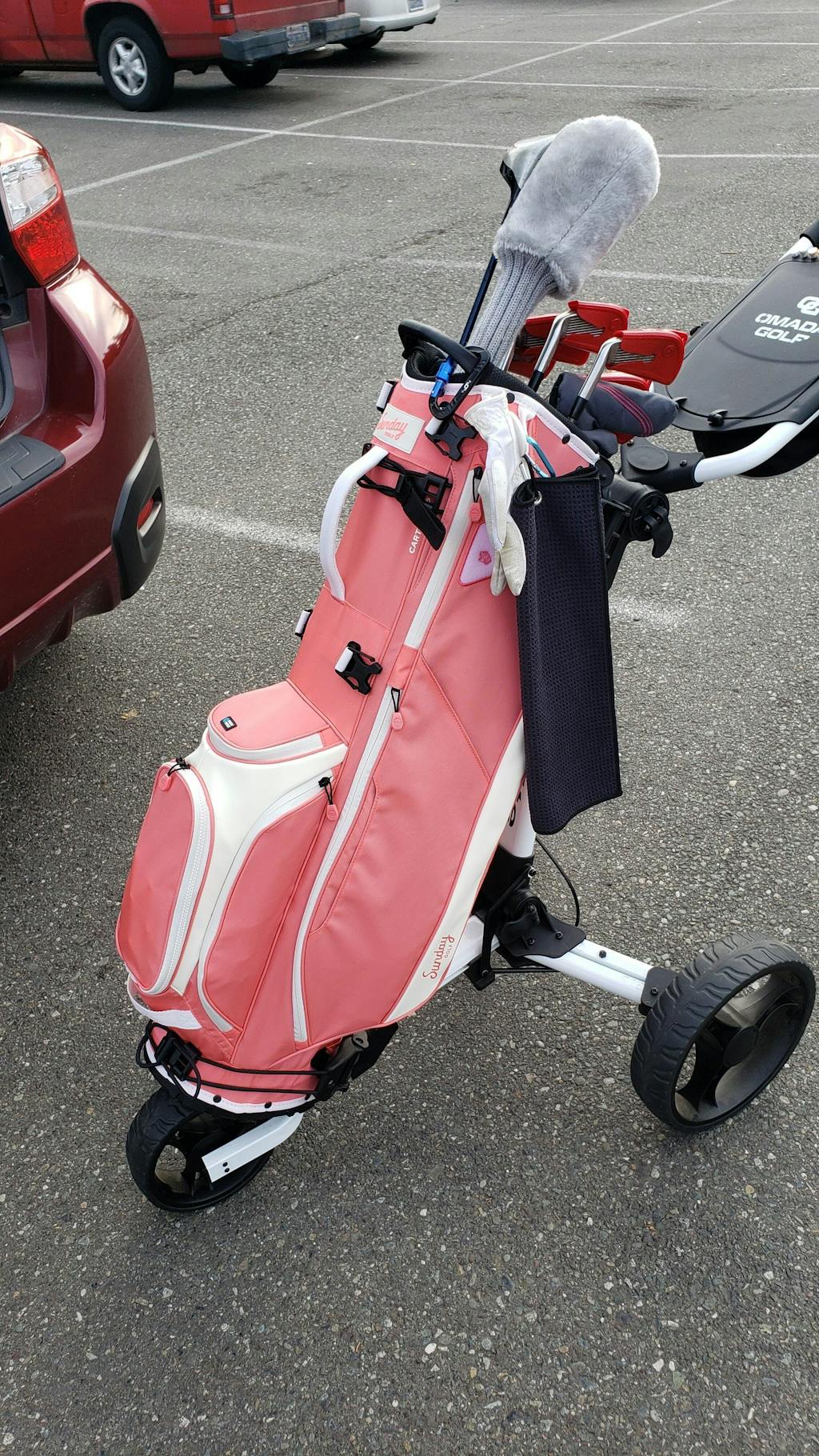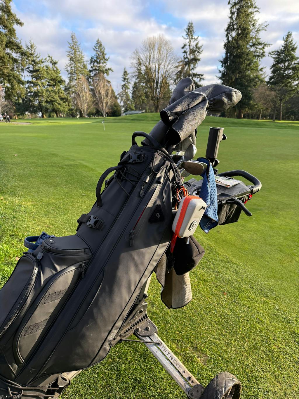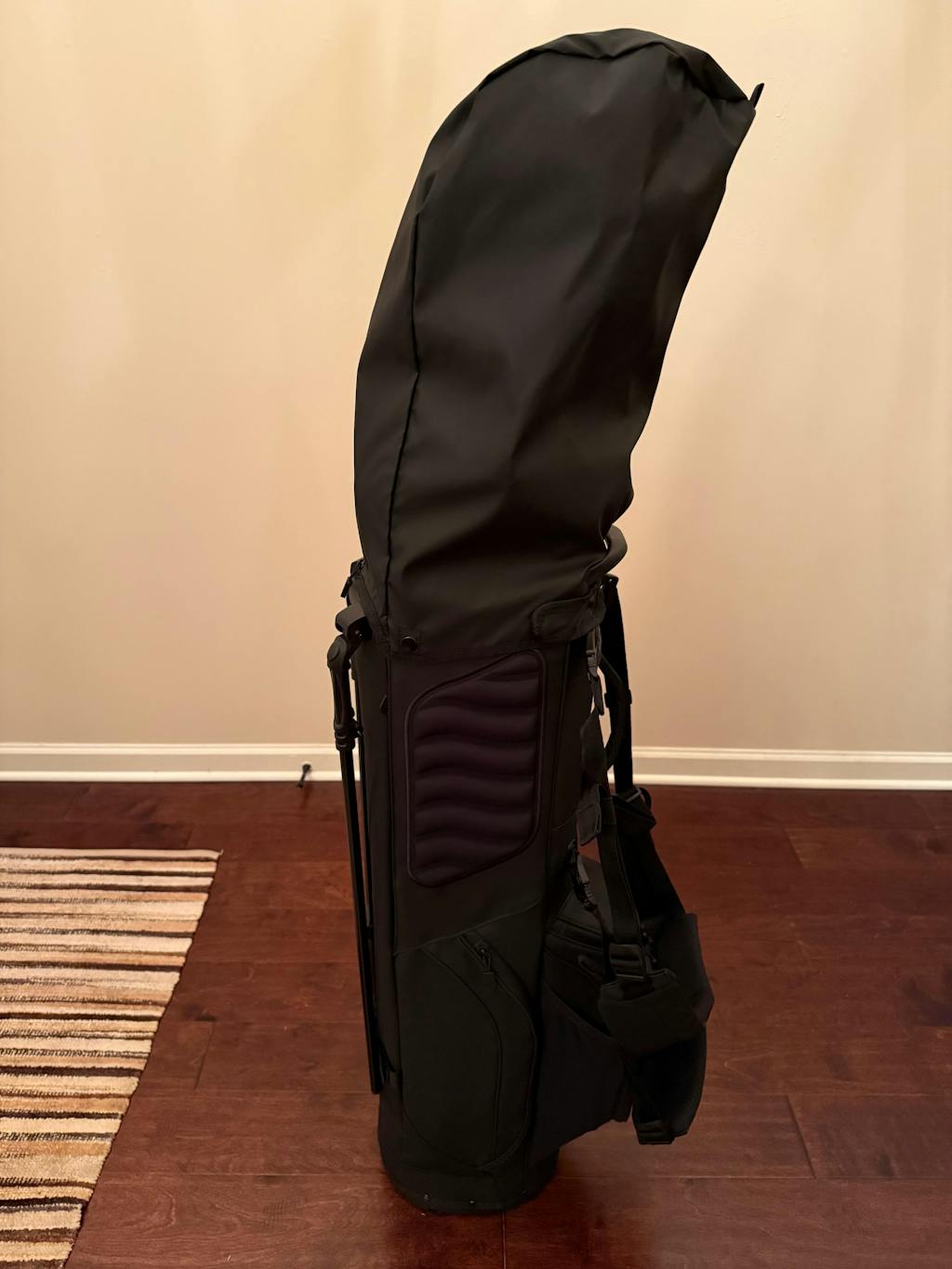 I can’t imagine owning a higher quality bag made for resisting water. I mean, even the rain hood is made out of a “rain coat“ type of material. It was not an afterthought, it was part of the planned design. These Sunday Golf guys are good! And I LOVE the tee holders on the outside of the smell proof pocket. Also, I’ve always been the golfer that has a caddy/ pouch on the towel ring to hold extra stuff. But with the smell proof pocket, I don’t even need one of those anymore! The full club dividers are awesome as I don’t deal with much club tangle anymore, if ever. I love that the bag stands up straight on its own, and the fully round bottom of the bag makes it easy to fit on a cart. And last but not least…to my Nitron Push Cartel members…this bag fits on our push carts! Look at my pictures. It’s a snug fit, but it essentially sits on the cart like a bag with “Top Lok” technology would.