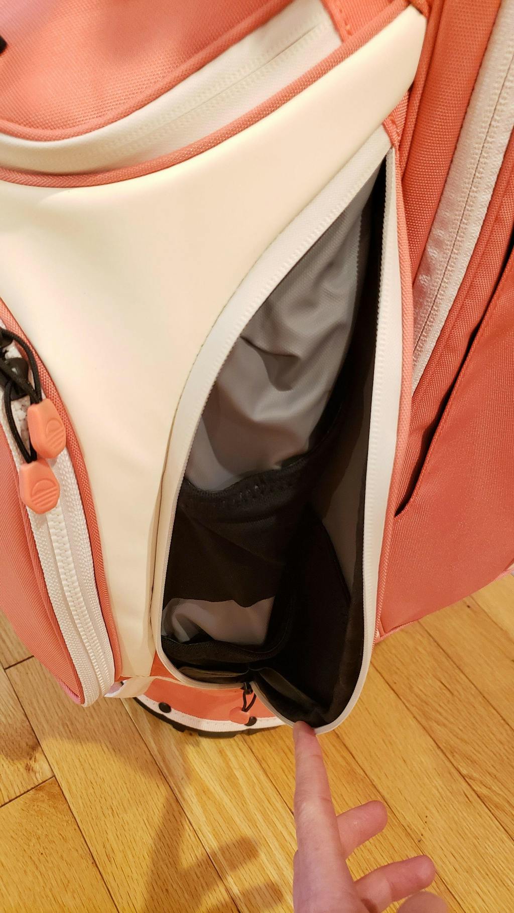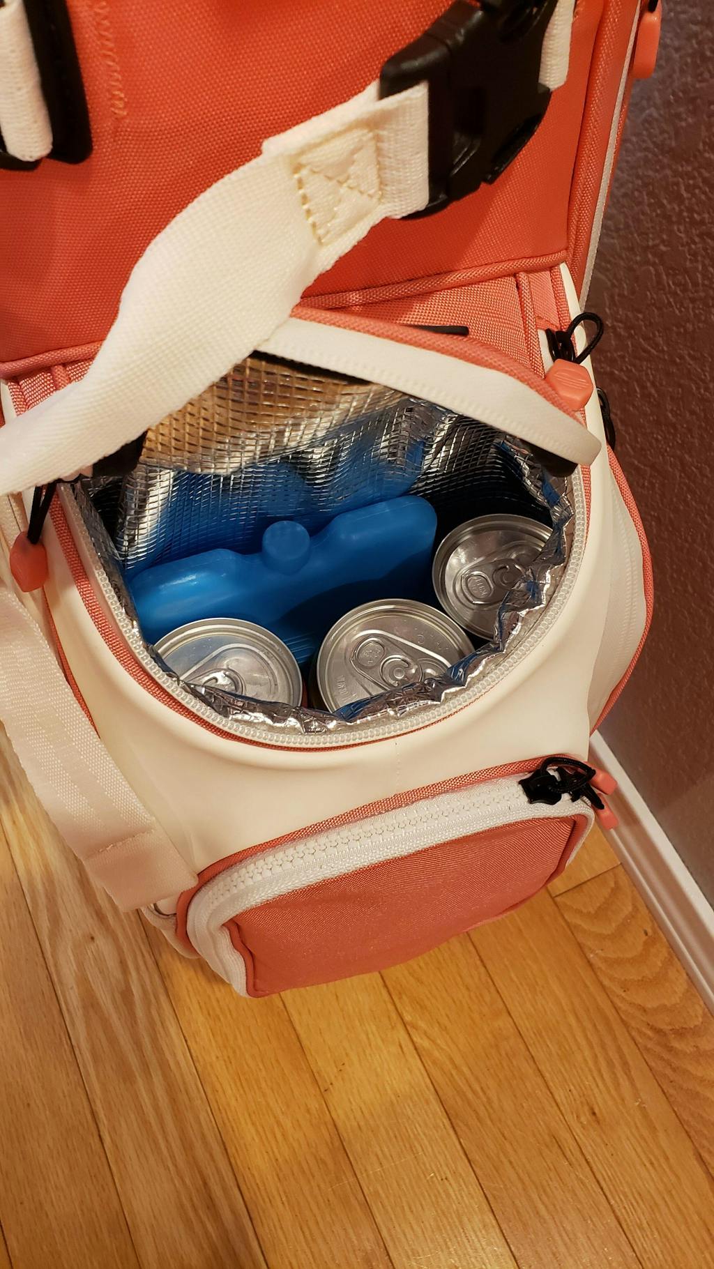 I love my new Ryder Coral golf bag. I like the pockets, how lightweight it is, and the fun color. The frosty pocket can easily fit 3 cans with a small ice pack if desired. The 4th can does technically fit, even with a small ice pack, but it is definitely a tight fit. I typically use slim cans and was able to fit 3 cans vertically with one can horizontally on the top. I was concerned that the ball pocket and frosty pocket would be competing with each other for space, but the ball pocket has plenty of room below the frosty pocket so it's not an issue. I especially like the easy-access pockets on the outside of the apparel pocket. I use one for tees and one for my phone. The smell-proof pocket is not really for me. It could be convenient with the elastic pouches it has inside, but overall the smell-pocket is really tight and can't fit much so I don't see value in that pocket. The legs work well. The bag also stands up flat on its base without the legs just fine. I like that the straps are removable since I usually use a push-cart and don't need the straps anyways. I haven't had any problems with my clubs getting tangled up together or difficult taking them in/out. Great bag, and I'm very pleased!