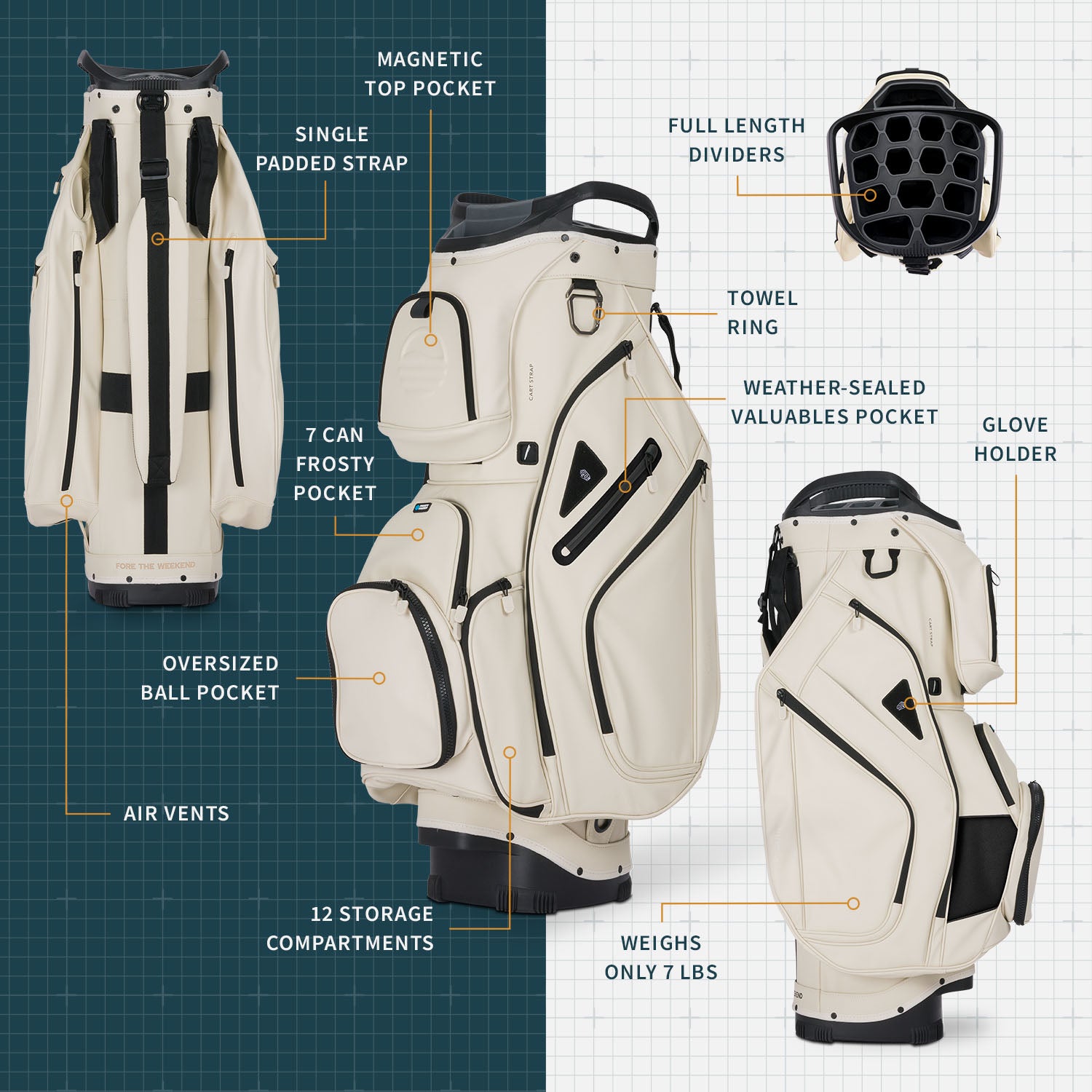 The Big Rig Cream Cart Bag brings max storage and premium style to your game. Crafted in vegan leather with a clean Cream finish, it’s built for the cart and ready for every round.